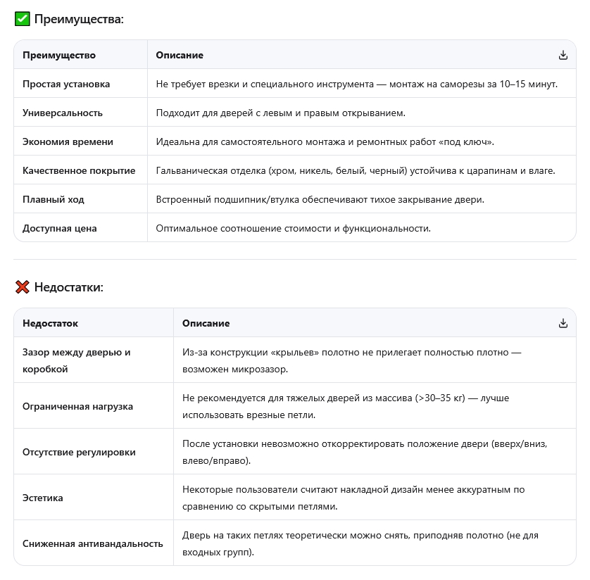 Рекомендация: Петля RUCETTI RFH-100752,5 — отличный выбор для легких и средних межкомнатных дверей (МДФ, экошпон, каркасные) в квартирах и офисах, где важна скорость монтажа и отсутствие сложных работ. Для тяжелых полотен предпочтительнее врезные или скрытые петли.