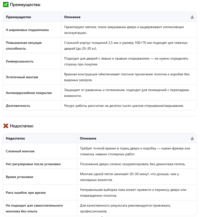 Рекомендация: Петля RUCETTI RS 100×70×2.5-4BB — оптимальный выбор для качественных межкомнатных дверей из массива или МДФ, где важны надежность, бесшумность и эстетика. Идеальна для квартир, офисов и помещений с высокой проходимостью. Для быстрого монтажа «своими руками» без инструмента рассмотрите накладные петли-бабочки.