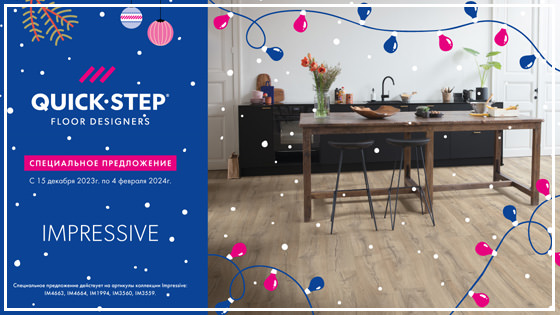 Акция проходит до февраля 2024 года, на несколько водостойких дизайнов ламината Квик-Степ. Скидка 20% с 14.12.23 по 4.02.24 от производителя UNILIN на следующие артикулы:
