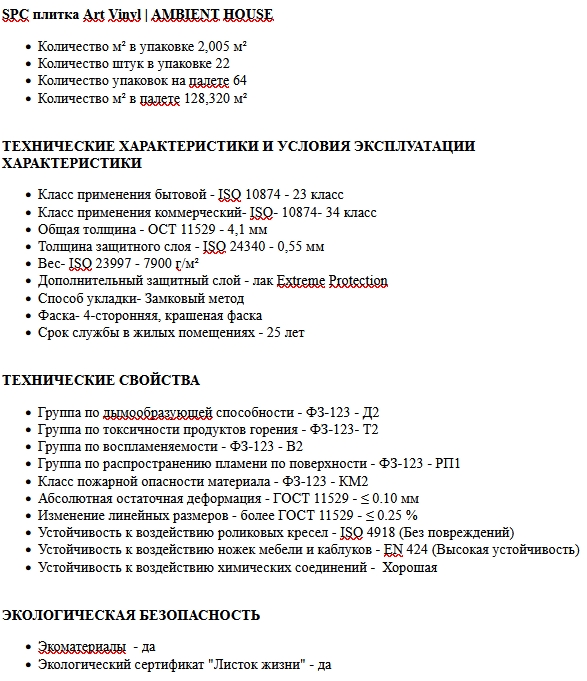 Коллекция Ambient House от Таркетт - это замковая, виниловая spc плитка, укладывается рисунком ёлочка. Полностью влагостойкая, долговечная и очень прочная (состоит из композитов, измельчённой горной породы и микромрамора), с усиленным верхним слоем 0,55 мм, и покрытым специальным лаком Extreme Protection, что позволяет полу быть защищенным от истерания, и стойким к нагрузкам от тяжёлых предметов (мебели и т.д). Замковое соединение Tarkett Click - очень надёжное, при укладке по рекомендациям и ГОСТу напольное покрытие прослужит достаточно долгое время, замки не разойдутся.