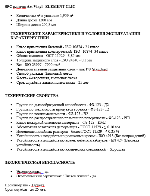 SPC-Плитка Tarkett Element Click – Прочный, водостойкий, каменный ламинат, экологичный, замковый - идеально подойдет для любых помещений в доме, квартире - коридор, кухня, залы, комнаты, а её экологичность подойдет для укладки даже в детских комнатах. Защитный слой 0,3 мм. 4-сторонняя микро-фаска придадут уверенность и добавят внешней эстетики и имитации ламината. Благодаря хорошему качеству замков, легко укладывается, поверхность плитки очень просто моется, практически любыми средствами для ухода за полом.