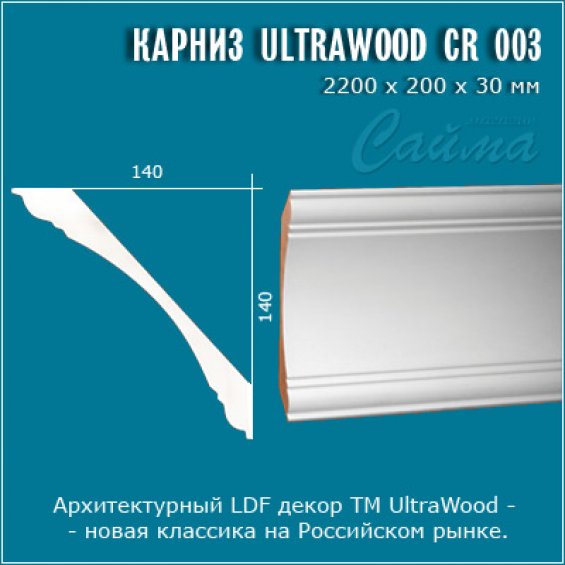 Карниз UltraWood CR 0003 i – это замечательный элемент оформления для всех видов помещений, монтаж которого производится на место стыка потолка и стены. Выпускается в длине 2.00 и 2.44 метра погонных. Внешний вид данного декора способен изменить Ваш интерьер до не узнаваемости, придав комнатам великолепие, красоту и шик. Волокнистая структура (LDF - древесноволокнистая плита низкой плотности) делает его сверхпрочным к механическим повреждениям. ЛДФ материал эластичен и не дает усадки. Монтируется при помощи жидких гвоздей, гвоздей с маленькой шляпкой, саморезами.